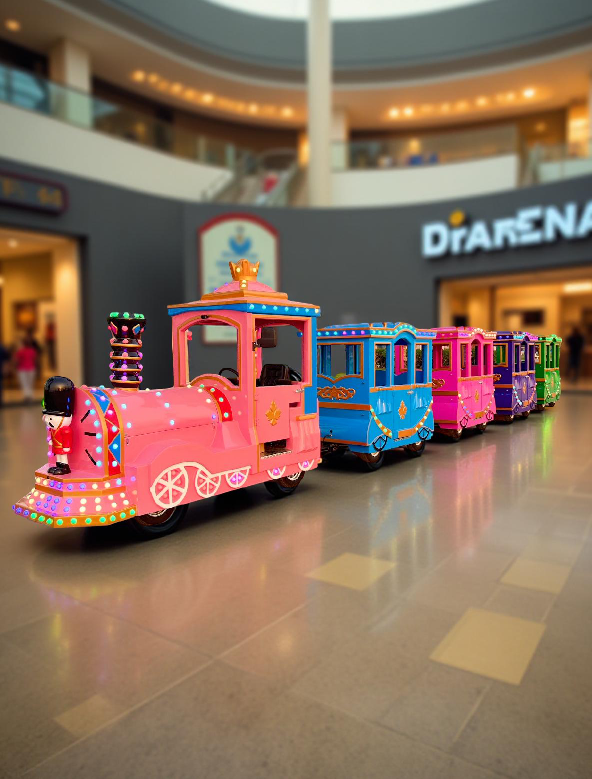 قطارات حديثة مناسبة للأطفال في المولات. تتميز هذه القطارات بألوان عرباتها وإضاءاتها التي تبعث البهجة للأطفال.